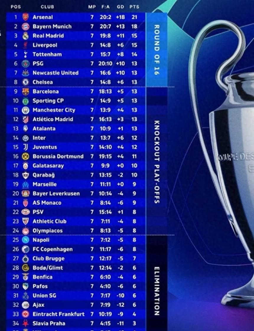其余12支豪门——包括亚特兰大、马德里竞技、巴塞罗那、切尔西、国际米兰、尤文图斯、利物浦、曼城、纽卡斯尔、巴黎圣日耳曼、皇家马德里、葡萄牙体育和托特纳姆热刺——虽已确保进入前24名(即获得附加赛资格),但距离直接晋级16强的“安全区”仍有一步之遥。